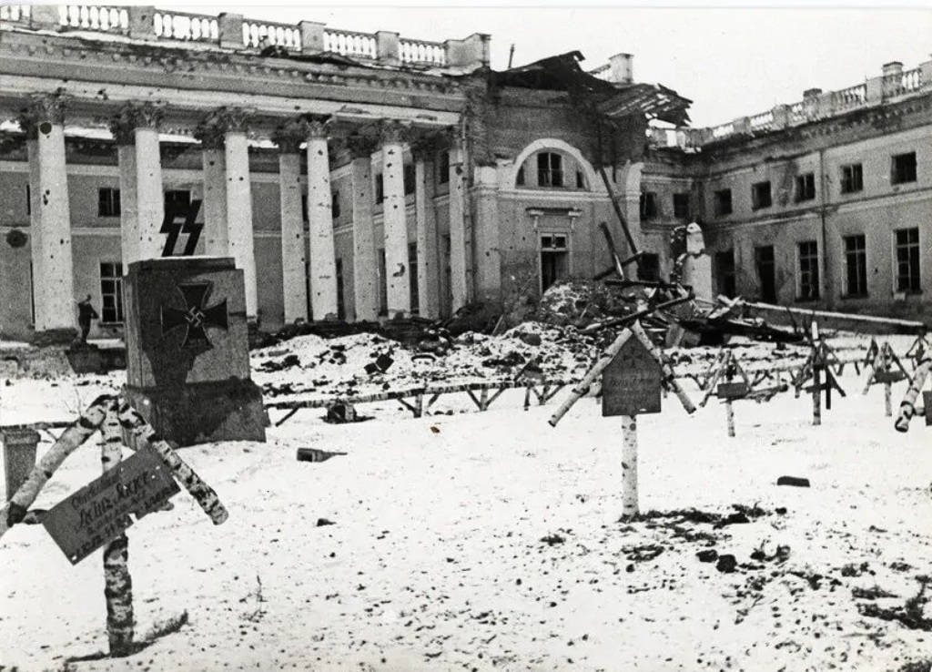By mid-September 1941, the Alexander Palace – along with the rest of Pushkin [Tsarskoye Selo] – was near the front line. During the occupation of Pushkin, the Nazi Headquarters was located in the Alexander Palace, the torture chambers of the Gestapo located in the basement, and a cemetery for 85 SS officers was created in the lawn, situated in front of the palace.