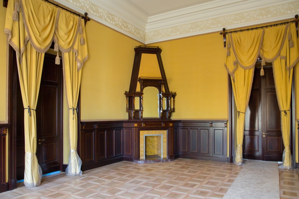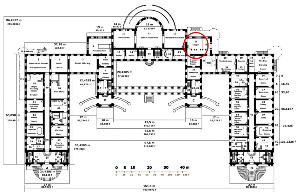 The second part of the ball took place two nights later, on 26th (O.S. 13th) February: all the guests dressed in 17th-century style costumes, made from designs by the artist Sergey Solomko, in collaboration with historical experts. Among the 390 guests, were 65 “dancing officers” – all dressed as 17th century archers or falconers – and personally appointed by the Empress . Members of the Imperial Family gathered in the Malachite Room, others in the adjacent areas. When ten o’clock struck, the guests went to the Concert Hall to dance. The court orchestra, wearing costumes of trumpet-players of Tsar Alexei Mikhailovich performed behind a gilt grating, while 34 round tables were arranged in the Nicholas Hall for dinner. The Concert Hall and Small Dining Room accommodated bars, the Malachite Room, tables with tea and wine.