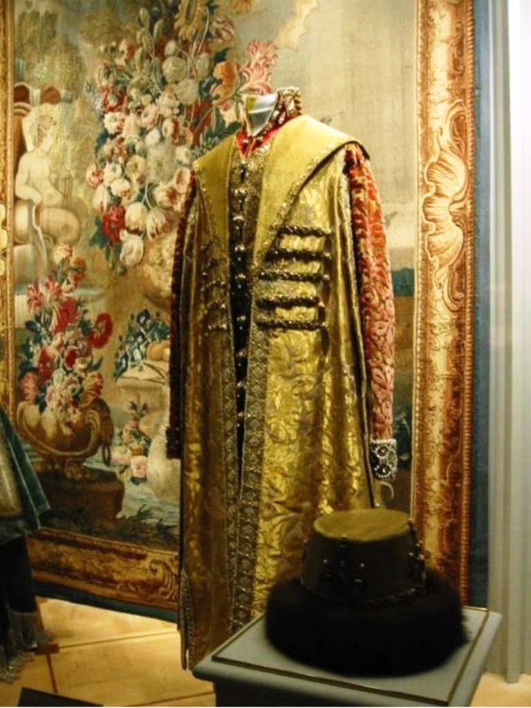 Kaftan worn by Emperor Nicholas II (right). Manufactured: Russia, 1903, cufflinks and buttons – Constantinople 2nd half of the 17th century. Materials: Golden velvet, silk, satin. Work: Sewing, casting, chasing.