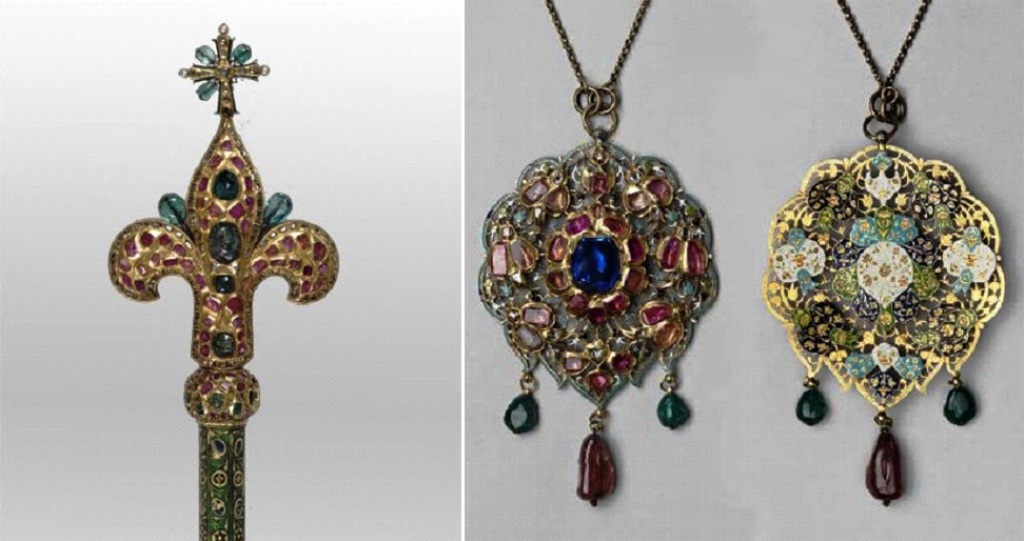 Rod (staff) of Tsar Alexei Mikhailovich. Istanbul, mid-17th century Gold, precious stones, pearls, iron; casting, chasing, carving, enamel. Collection of the the State Armoury Museum.