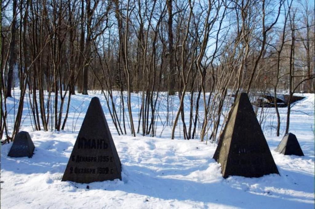 The pet cemetery on the Children’s Island, which is situated a near the Alexander Palace, has miraculously survived to the present day. A small path leads from the Children’s House to four graves marked by small pyramids, which are hidden from view on the western side of the island.