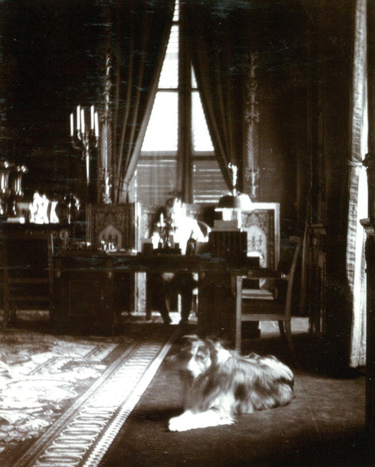 PHOTO: Emperor Nicholas II in his study with his dog ‘Iman’ at the Château de Compiègne, during his second visit to France in 1901