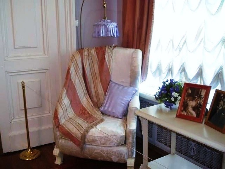 Situated in a corner of the Mauve (Lilac) Boudoir of the Alexander Palace, was a large, plush arm-chair with a high backing, and covered with the Moscow-made silk. This corner is among the most photographed spots in the Alexander Palace. There are countless photos of the Empress Alexandra Feodorovna, Emperor Nicholas II and their five children posing in the now iconic arm-chair.