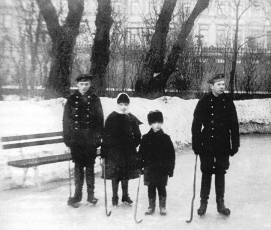 PHOTO: Grand Duke George, Grand Duchess Xenia, Grand Duke Mikhail and Grand Duke Nicholas Alexandrovich [future Emperor Nicholas II] playing ice hockey on the skating rink of the Anichkov Palace, St. Petersburg. 1880s.