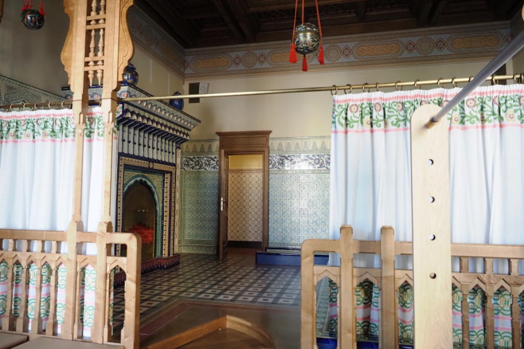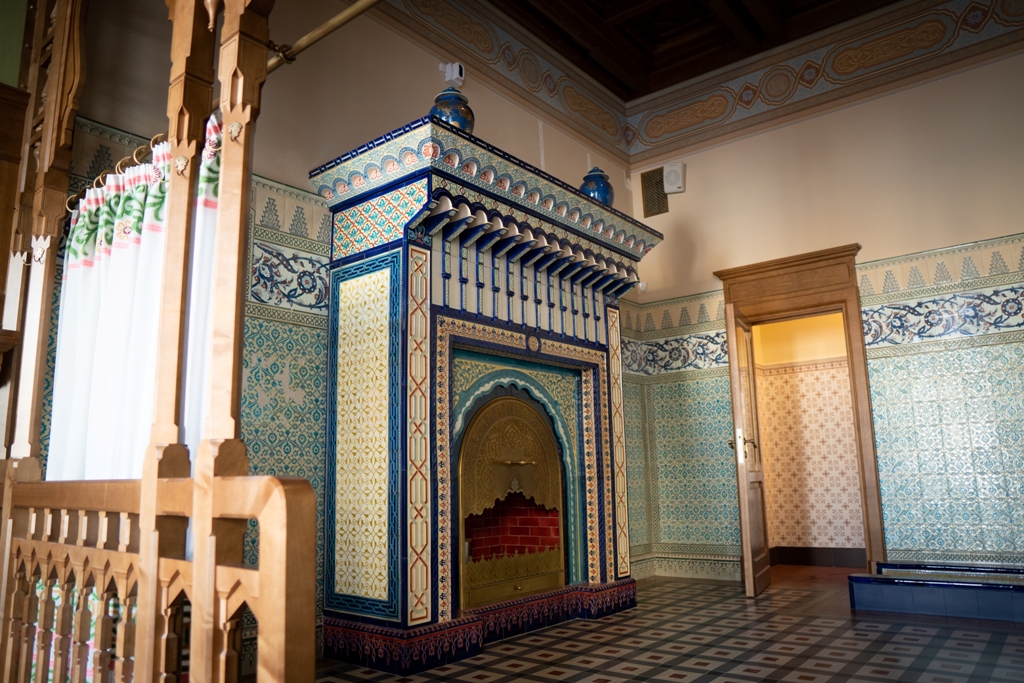 During dismantling work in the Moorish Bathroom of Nicholas II, craftsmen discovered the basin of the pool under the floor, and in it they found fragments of the original Metlakh ceramic on the walls. These tiles aided experts with the recreation of the original interior decoration of the Moorish Bathroom, with the aid of black-and-white photographs taken in the 1930s.