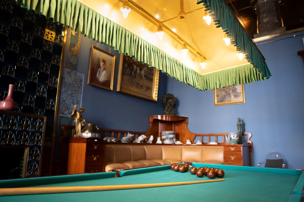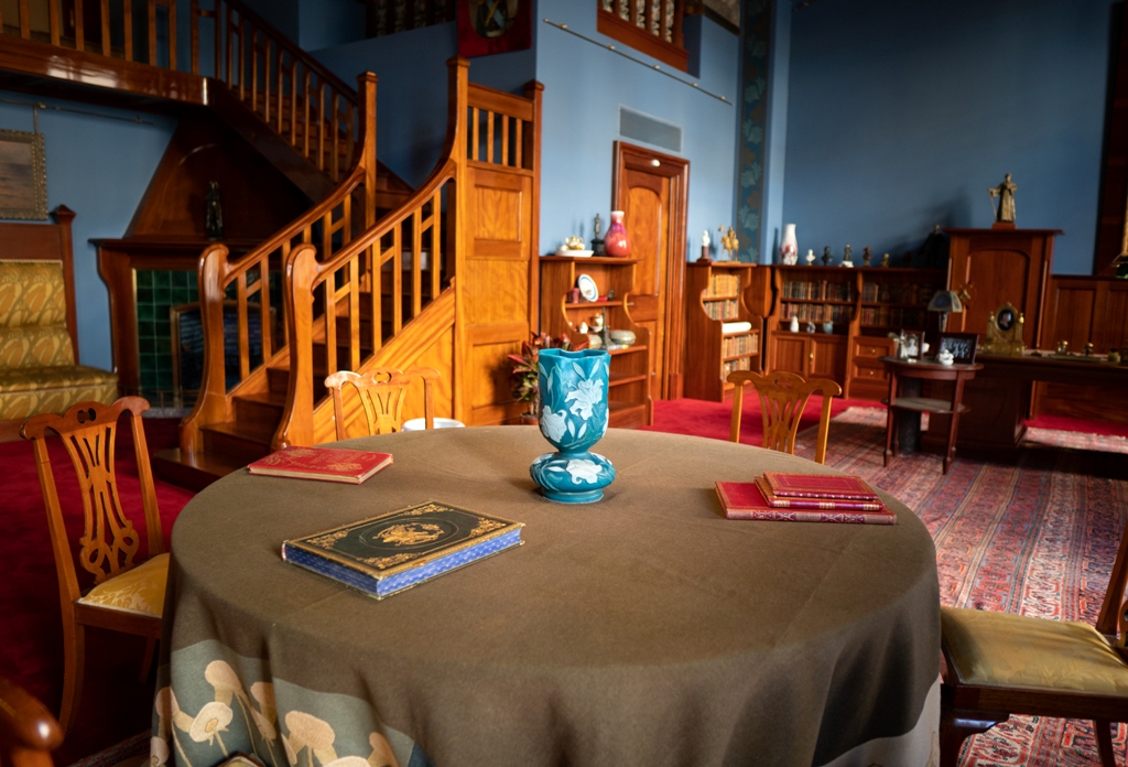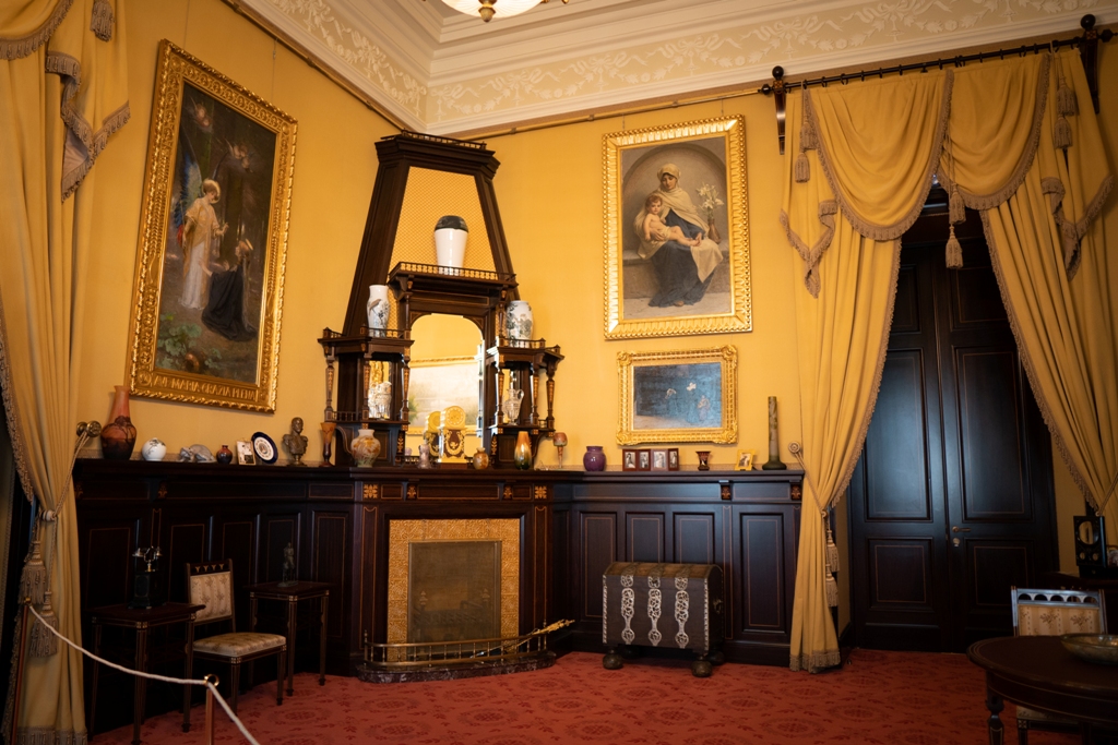 Works: the fabric upholstery of the walls, curtains, furniture, carpet, wood panels, a fireplace, a picturesque frieze were all recreated.