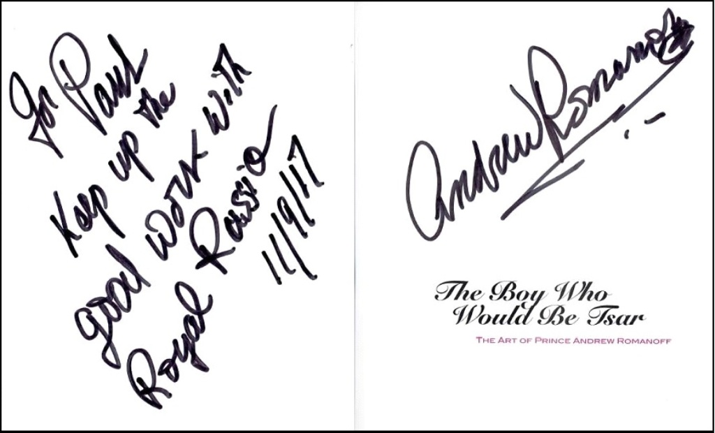 In 2017, I was presented with this copy of The Boy Who Would be Tsar. The Art of Prince Andrew Romanoff. It remains a treasured keepsake in my personal library. This 64-page autobiography is illustrated with family photographs and his artwork. Prince Andrew gives readers a glimpse life growing up in the guest house of Windsor Castle, where he spent his childhood with his sister and brother, granted to his family by King George V.