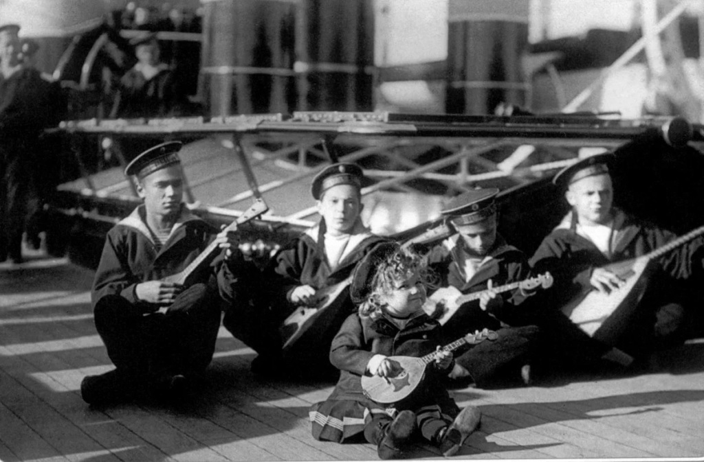 Empress Alexandra Feodorovna, a German by birth, enjoyed the sound of a three-stringed balalaika. She first heard the tunes of the Cossack-balalaika players when she first arrived in Russia. Initially, Alexandra Feodorovna wanted her daughters to take up playing a folk instrument, but in the end, it was her son Tsesarevich Alexei Nikolaevich who became interested in the instrument. Judging by a photograph [seen below] taken on the Imperial yacht Standart in 1907, Alexei had already picked up the balalaika at the age of three.