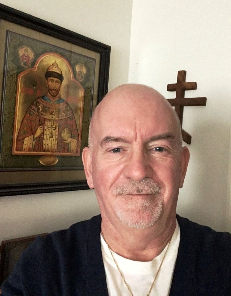 PHOTO: Paul Gilbert poses in front of his lithograph copy of the original miraculous Myrrh-Streaming Icon of Tsar-Martyr Nicholas II, gifted by Ija Schmit(1936-2018) in 1996