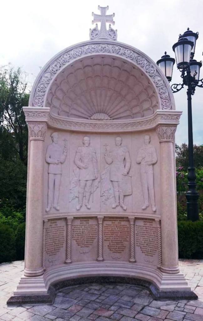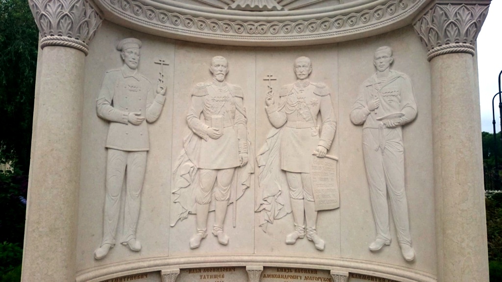 The sketches for the monument were prepared in the icon-painting workshop by the sisters of the Novo-Tikhvin Convent Striving for historical accuracy, the sisters consulted on archival documents and photographs of the uniforms and respective awards worn by Prince V. A. Dolgorukov, I. L. Tatishchev, K. G. Nagorny and I. D. Sednev. In addition, they consulted with historians and other experts on the history of the uniforms of the Russian Empire. At the same time, in order to show the height of the feat of the Tsar’s faithful subjects, who in fact were martyred, the sisters supplemented the images with details characteristic of icons: holding Orthodox crosses in their hands, and fluttering cloaks worn on their shoulders – this is customary for depicting Orthodox martyrs on icons. General Ilya Tatishchev is depicted holding the Gospel, which he knew by heart.