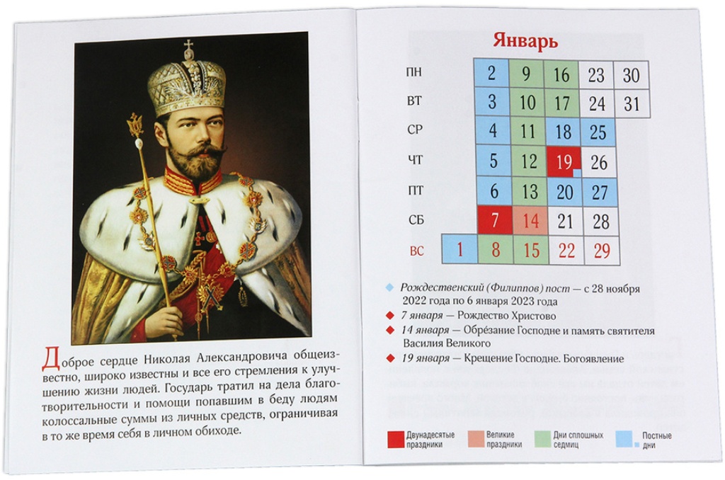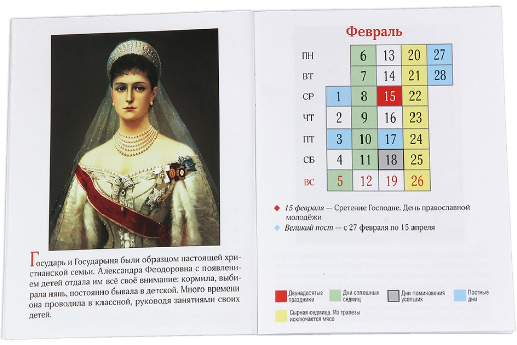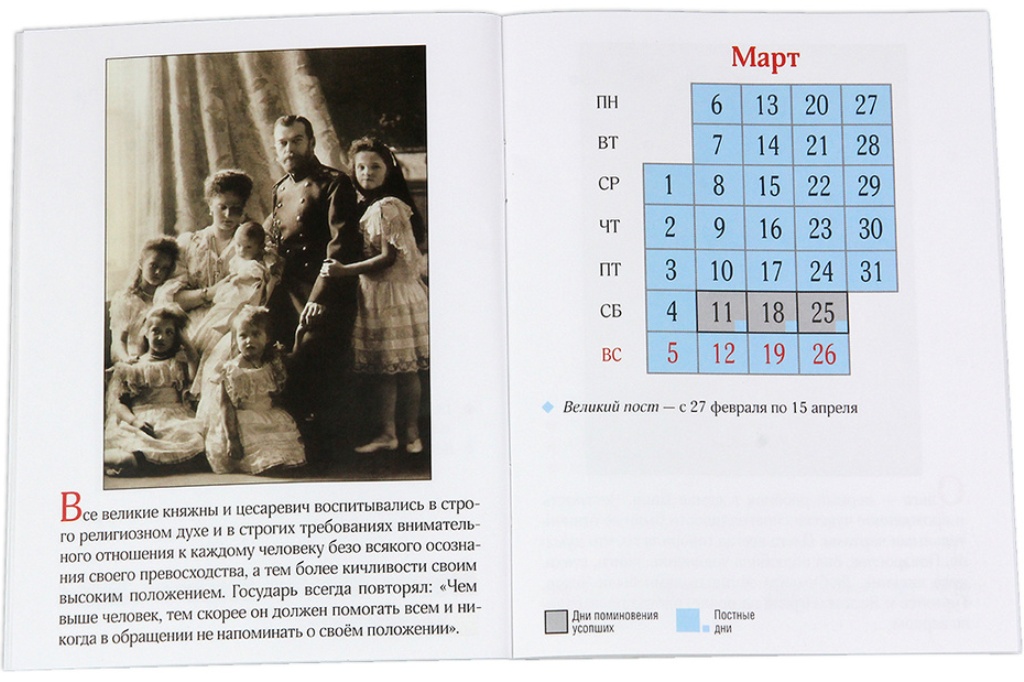 The calendar «Патриарх — детям. Царская семья. Уроки из жизни» [Patriarch to Children. Tsar’s family. Lessons from life] is designed to guide students and children on the holidays and fasts of the Russian Orthodox Church.