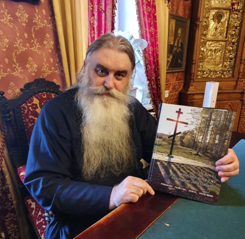 PHOTO: Archimandrite Tikhon (Zatekin) holding a copy of his new book ‘Романовы: убийство, поиск, обретение’ [Romanovs: murder, search, acquisition].