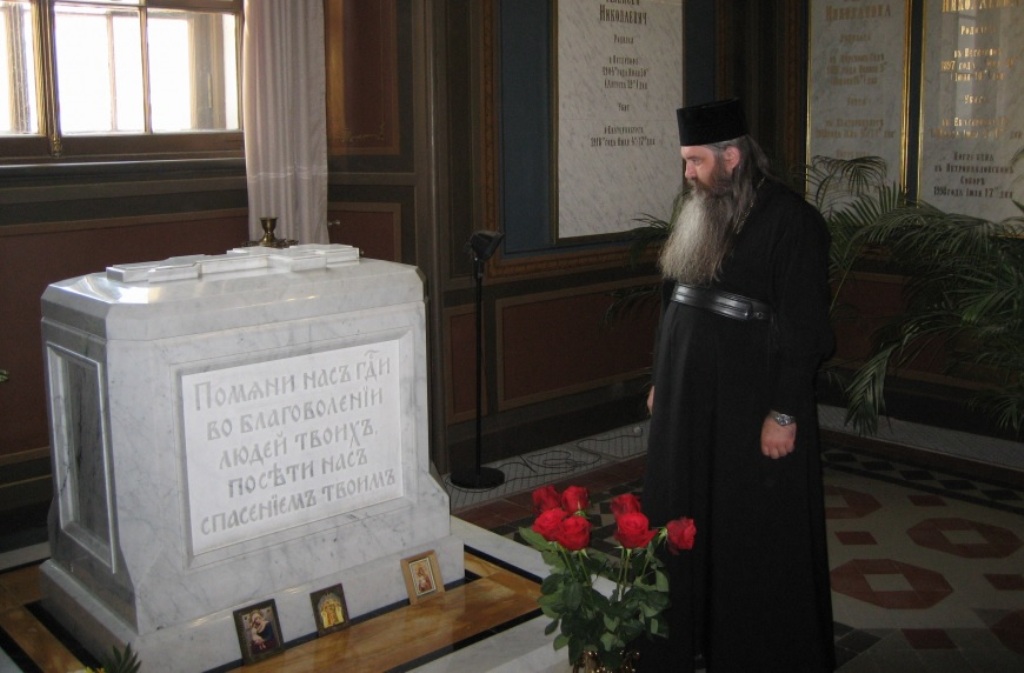 PHOTO: Archimandrite Tikhon (Zatekin) at the tomb of Emperor Nicholas II and his family, located in St. Catherine’s Chapel – a side chapel in SS Peter and Paul Cathedral – St. Petersburg
