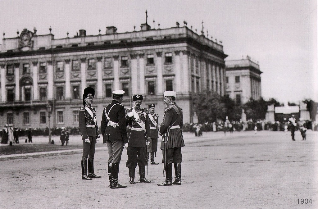 PHOTO: Commander-in-Chief of the Guards and the St. Petersburg Military District Grand Duke Vladimir Alexandrovich (center), talking with Grand Duke Dmitri Konstantinovich (left) and officers, before the parade of the Pavlovsky Life Guard Regiment, on the Field of Mars, St. Petersburg. 30th August 1904