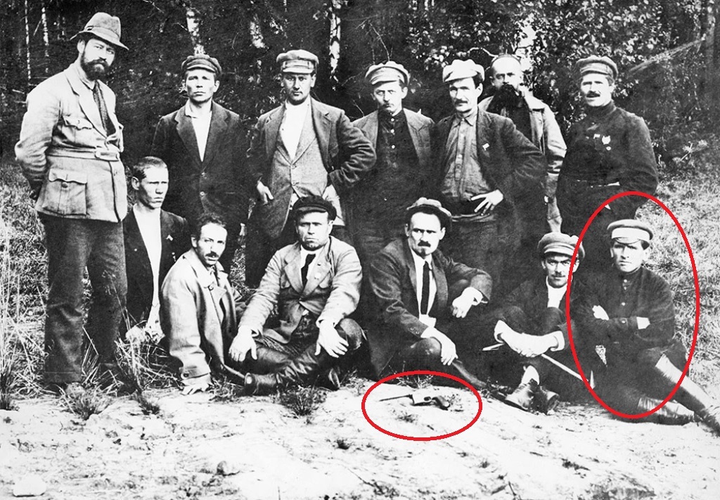 PHOTOS: (above) Ermakov standing on the grave of members of the Imperial Family and their retainers at Porosenkov Log in the 1920s; (below) Ermakov (far right) posing with a group of prominent Ural Bolsheviks on the Tsar’s grave, his Mauser pistol can be seen in the foreground in front of P.M. Bykov, author of The Last Days of Tsardom (1934)
