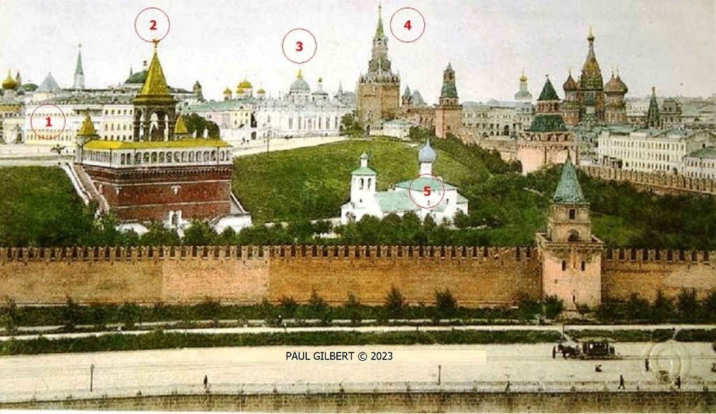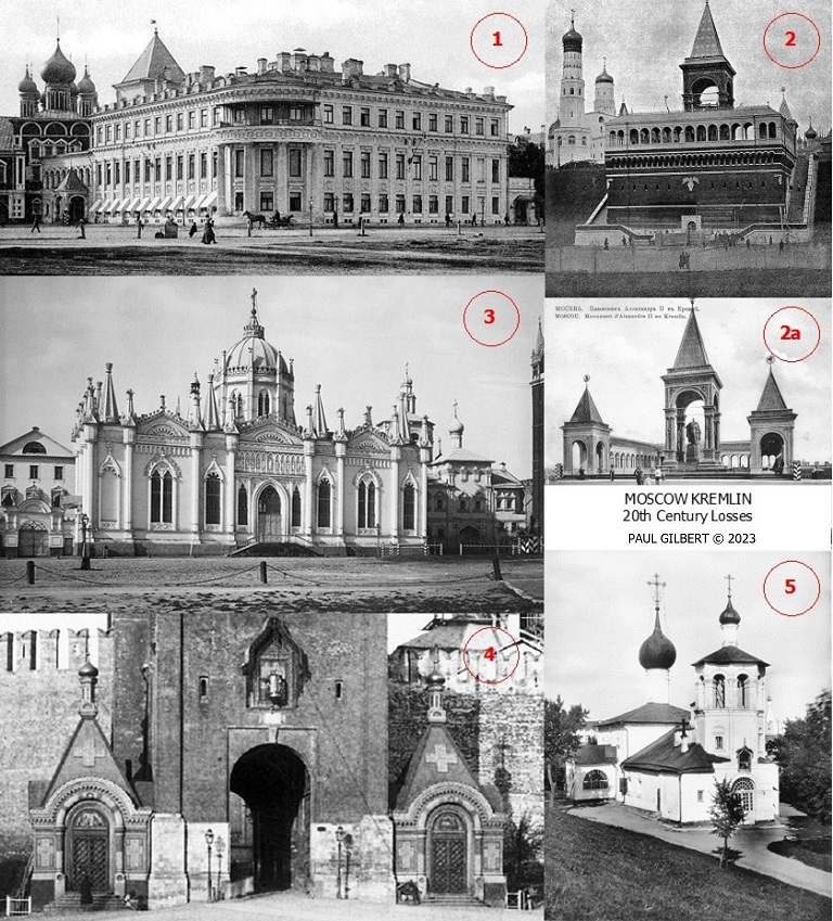 The early 20th century postcard (above) reflects some of the greatest architectural losses in the Moscow Kremlin during the late 1920s to early 1930s – please refer to the numbers and the accompanying images below for additional information about each respective monument . .