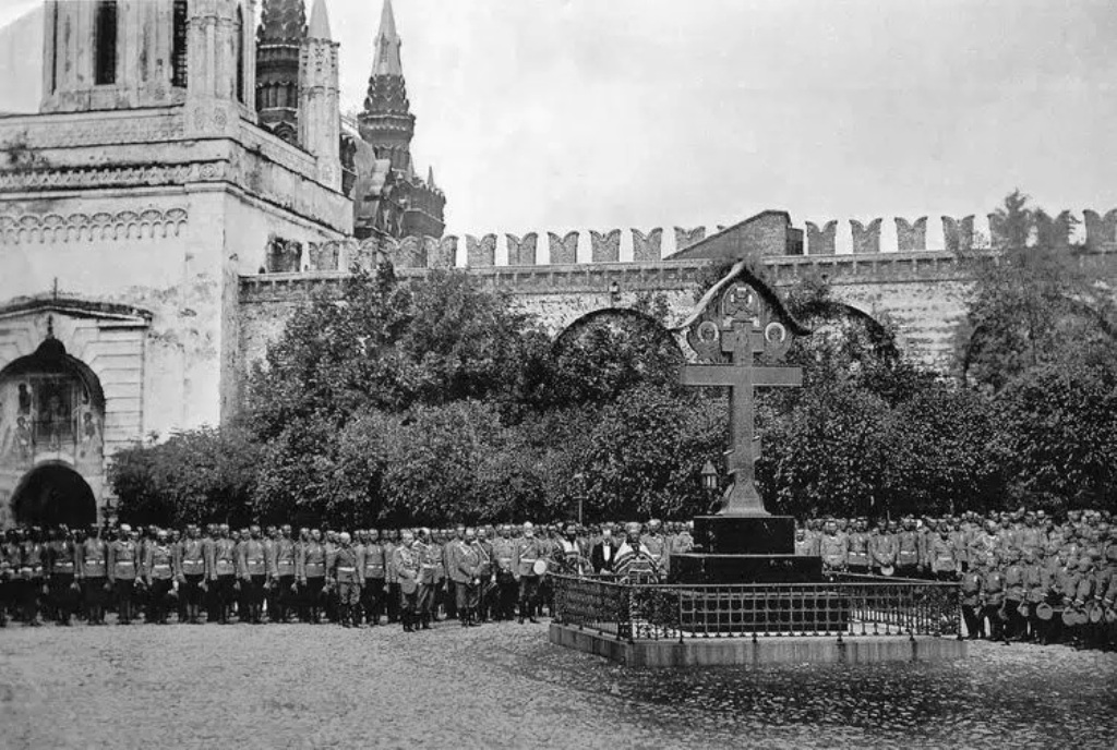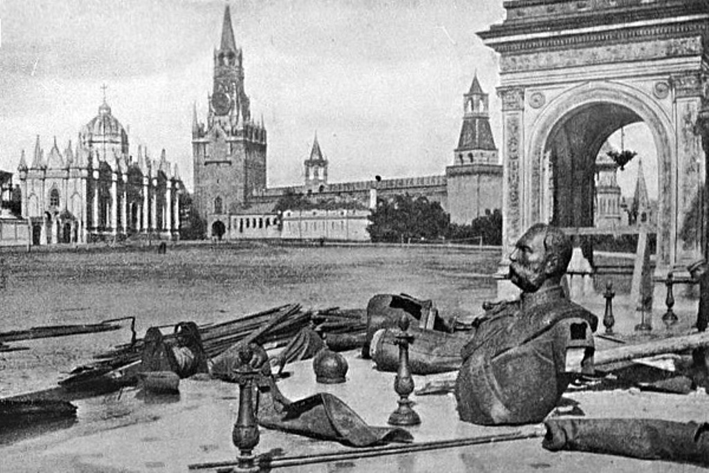 The monument to Alexander II was demolished by the Bolsheviks in the summer of 1918. In June 1918, Russian art historian Nikolai Okunev described this event in his diary: “I saw in the cinema a newsreel on the removal of the monument to Alexander II in the Kremlin. It was terrible to watch! It’s as if they were cutting a living person into pieces, and saying “Look, this is is how it’s done!” It’s not enough to show the shootings on the cinema screen.” The remaining columns and gallery were demolished in 1928.