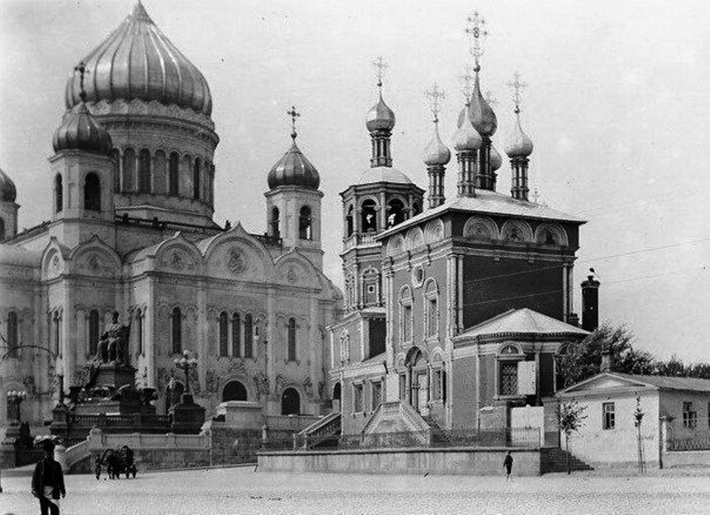 PHOTO: the Cathedral of Christ the Saviour (left), the Church of Praise of the Most Holy Theotokos (right) and a monument to Emperor Alexander III (also left). Moscow, 1912.
