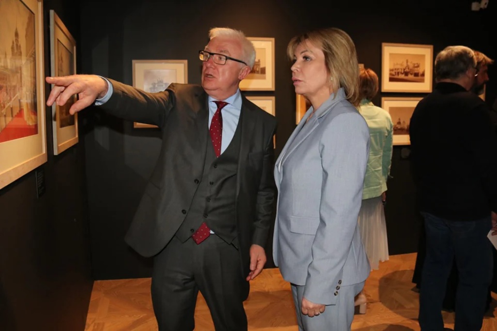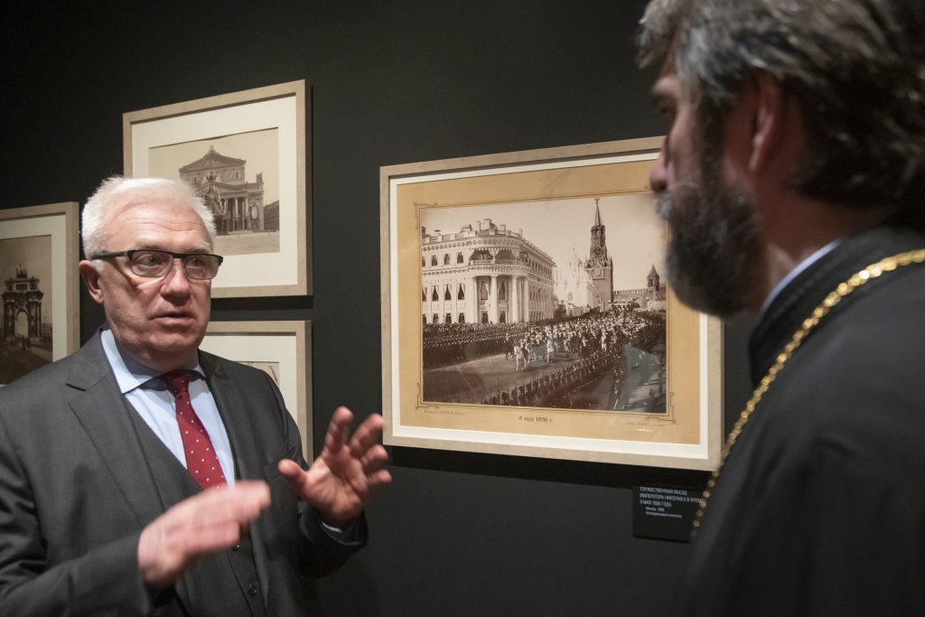 PHOTOS: the director of the State Historical Museum (Moscow) and curator of the exhibition Evgeny Lukyanov discusses watercolours (above) and photographs (below) depicting the Coronation of Emperor Nicholas II in Moscow, May 1896