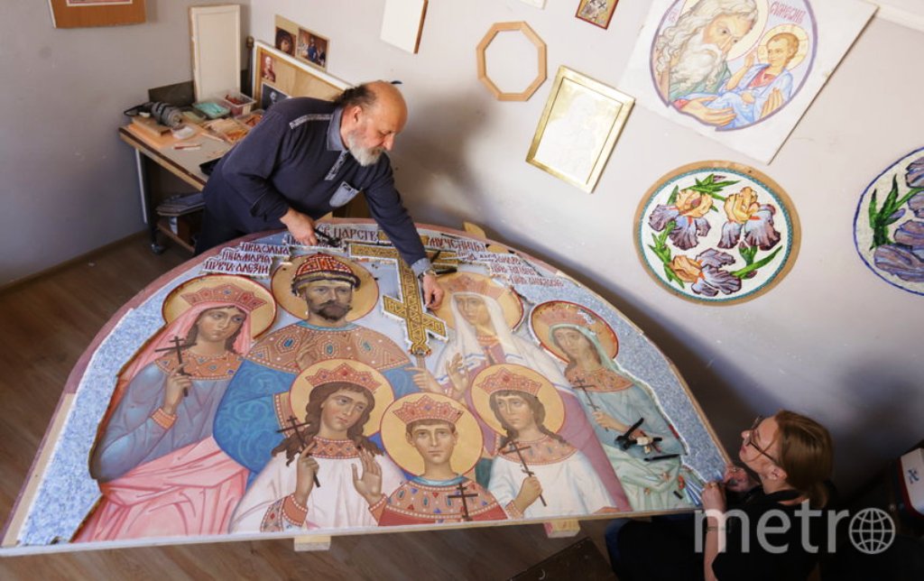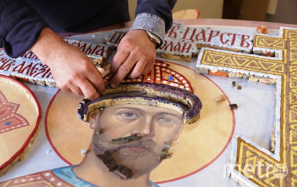 A three-meter mosaic icon depicting the Holy Royal Martyrs Tsar Nicholas II and his family is being assembled by a team of artists for the Alexander Nevsky Lavra in St. Petersburg. According to one of the artists: “each of the coloured smalt[1] mosaic tiles is so tiny, that the assembly is similar to creating a jigsaw puzzle.”