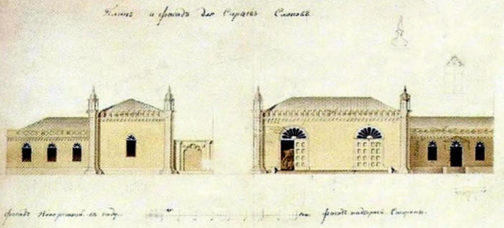PHOTO: architect’s rendering of the facade of the Elephant Pavilion. 1828 (above; early 20th century view of the courtyard of the pavilion (below)