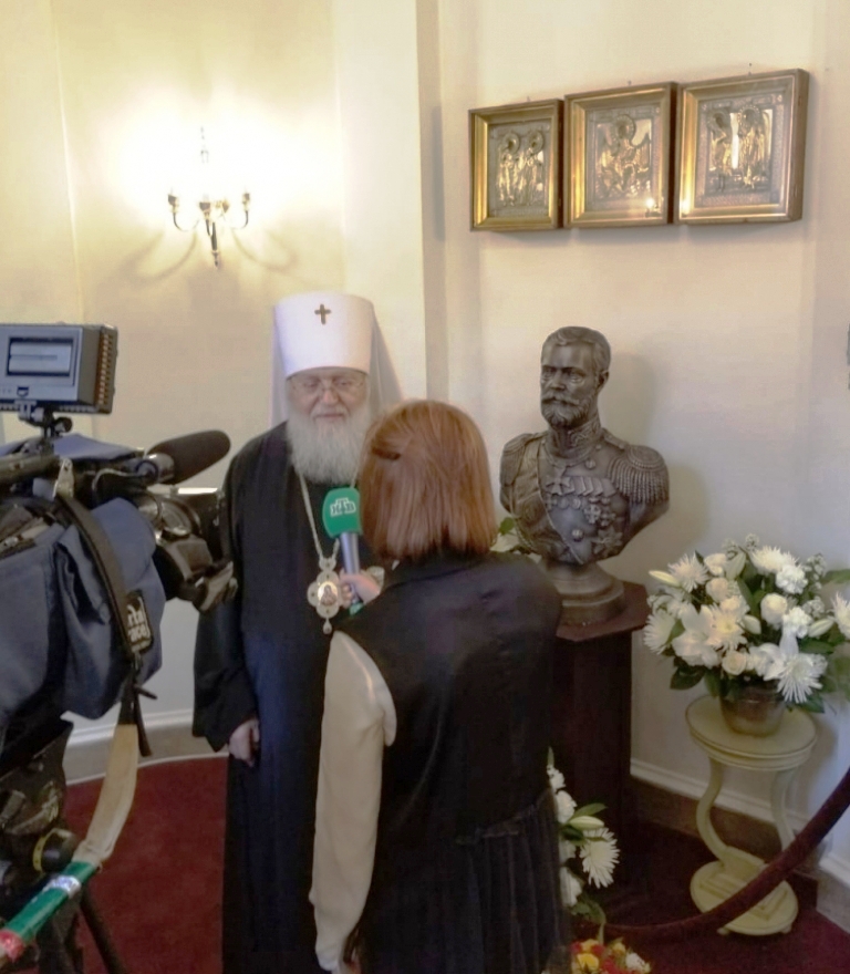Flanked by clergy, the First Hierarch proceeded to the entrance to the cathedral, where the bust of the Tsar-Passionbearer Nicholas II had been installed, and blessed it.The festivities concluded with a banquet in the cathedral hall.