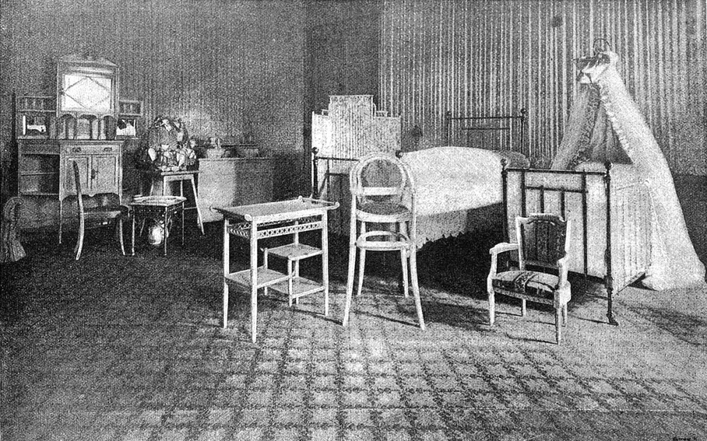On the second floor was Grand Duchess Olga Nikolaevna’s bedroom, which contained a small crib with white curtains, next to an iron bed for the wet nurse; furnished with white lacquered furniture.