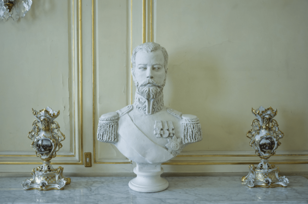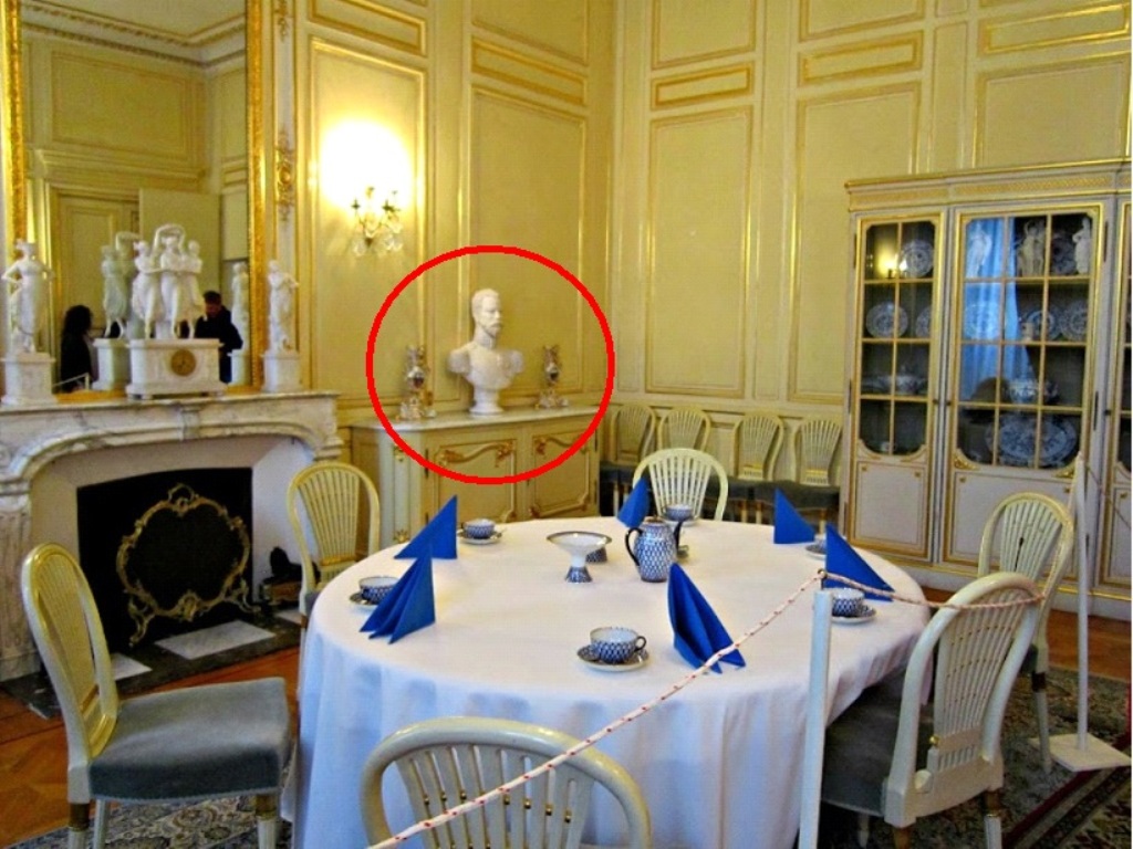 PHOTO: a bust of Emperor Nicholas II now rests on a side-table, next to the fireplace in the White Salon, formerly the Imperial Bedroom, during the Imperial Family’s visit in October 1896.