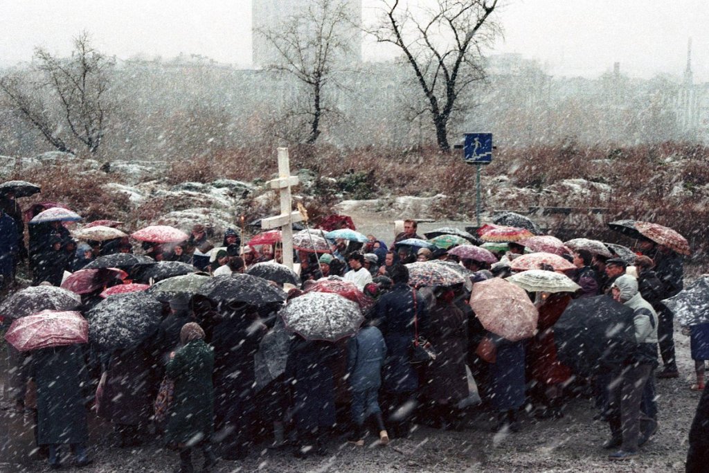 PHOTO: the demolition of the Ipatiev House did not deter Orthodox Christians from coming to the site to light candles and offer prayers for Russia’s repentance. Sverdlovsk [Ekaterinburg] 1990
