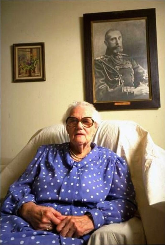 PHOTO: Princess Vera Konstantinovna seated in front of a framed portrait of her beloved father Grand Duke Konstantin Konstantinoivich (1858–1915). This photo was aken at the Tolstoy Foundation’s elderly care home in Valley Cottage, New York. 1988.