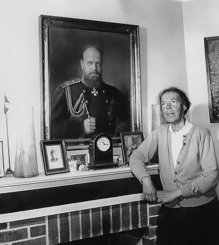 PHOTO: Grand Duchess Olga standing in front of a portrait of her father, which hung in the living room of her home in Cooksville, Ontario in the 1950s