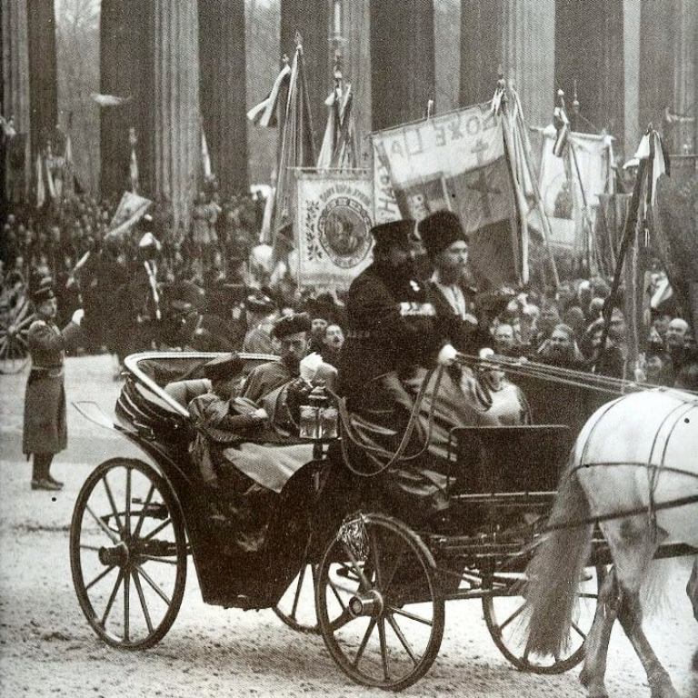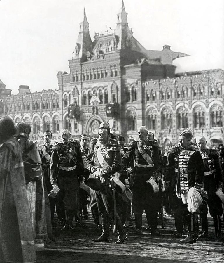 Emperor Nicholas II and his son, the heir to the throne Tsesarevich Alexei Nikolaevich travelled in an open carriage together. They were followed by the four-horse ceremonial carriage of the Dowager Empress Maria Feodorovna and Empress Alexandra Feodorovna, followed by a four-seater carriage with the the Tsar’s daughters: Grand Duchesses Olga, Tatiana, Maria and Anastasia Nikolaevna. The “Imperial convoy” consisted of 100 members of the Imperial Family, which included grand dukes, grand duchesses and princes and princesses of the Imperial Blood.