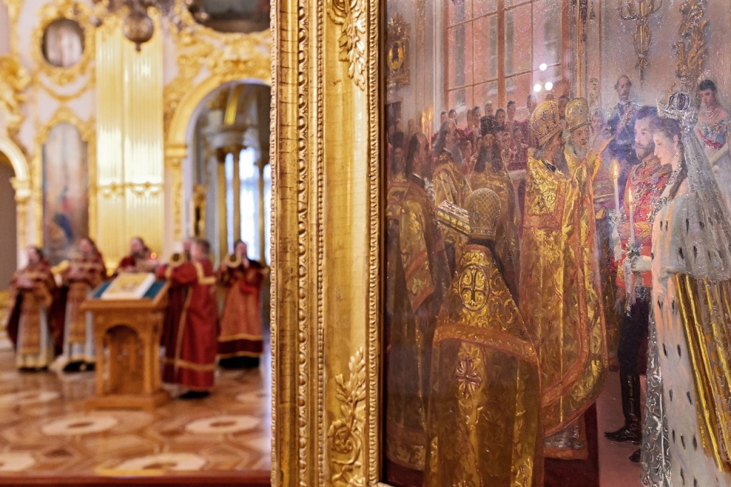 PHOTO: view of the the Church of the Savior Not Made by Hands in the Winter Palace. On the right hangs a painting depicting the wedding of Emperor Nicholas II and Alexandra Feodorovna, painted by Laurits Tuxen.