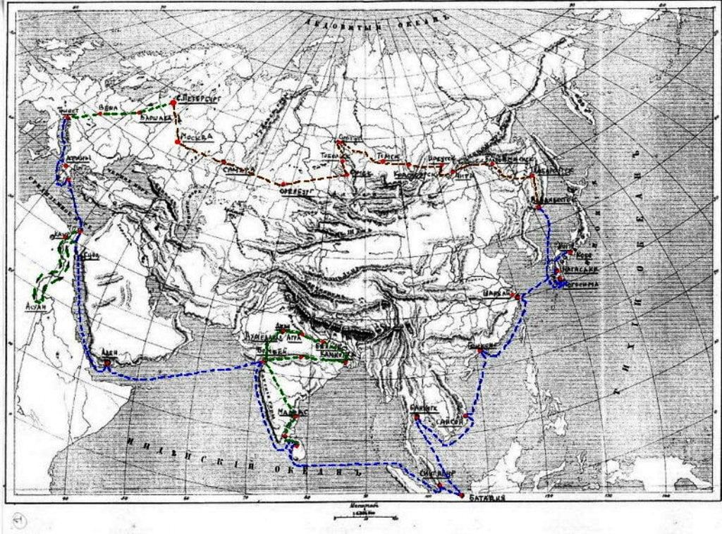 Recall that on 5th November (O.S. 23rd October) 1890, Tsesarevich and Grand Duke Nicholas Alexandrovich [future Emperor Nicholas II] embarked on a journey, which took him around the greater part of the Eurasian continent. The total length of the journey exceeded 51,000 kilometres, including 15,000 km of railway and 22,000 km of sea routes.