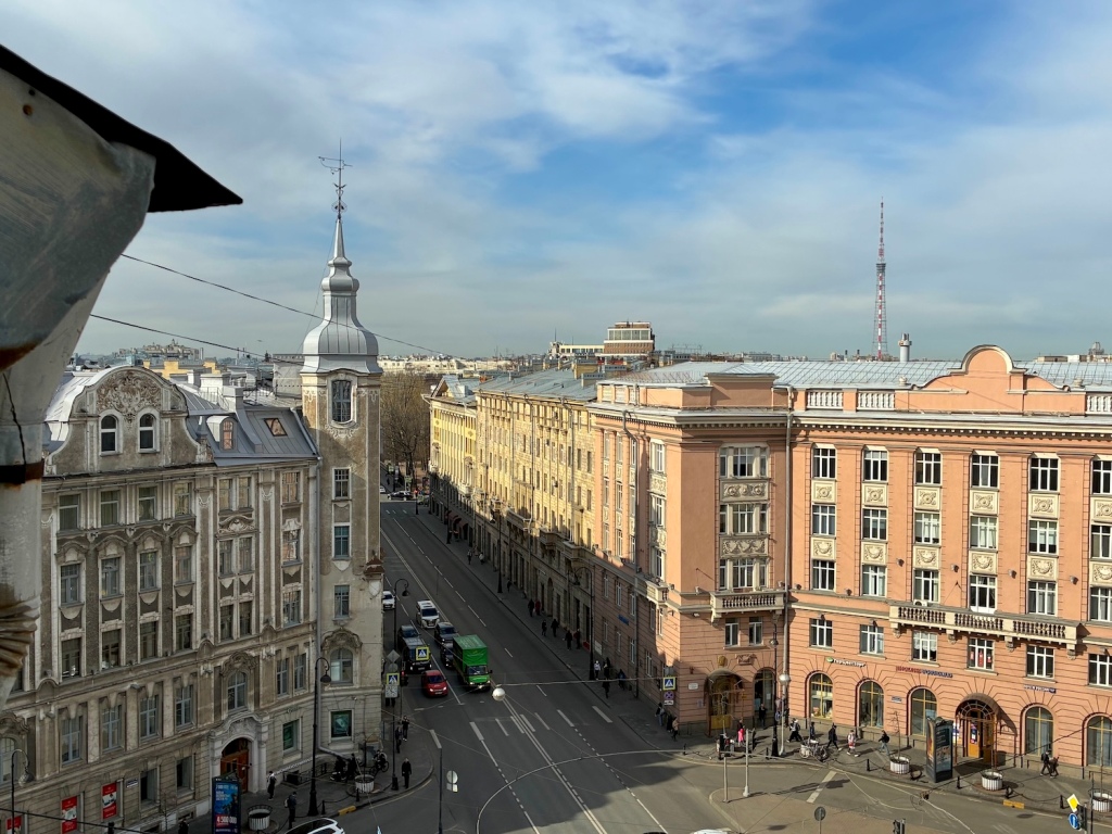 Despite the changes made during the Soviet years, the studio hall has retained the mezzanine and columns (seen in the photos above), but also the multi-meter windows, which offer a commanding view of the historic area. The windows of the apartment overlook Avstriyskaya Ploshchad (Austrian Square) and Kamennoostrovsky Prospekt, as well as the neighboring Gorbov apartment building, and the architectural dominants of the historic Petrograd district.
