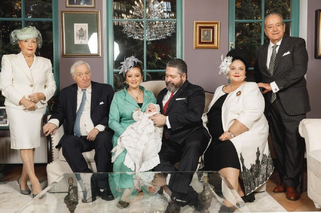 PHOTO: Masha at the baptism of her grandson in Moscow on 6th December 2022. From left to right: Carla Virginia Cacciatore, Roberto Amedeo Simeone Bettarini, Princess Victoria Romanovna, Alexander Georgievich Romanov, Prince George “Gosha” Mikhailovich, Princess Maria Vladimirovna and Prince Franz Wilhelm of Prussia