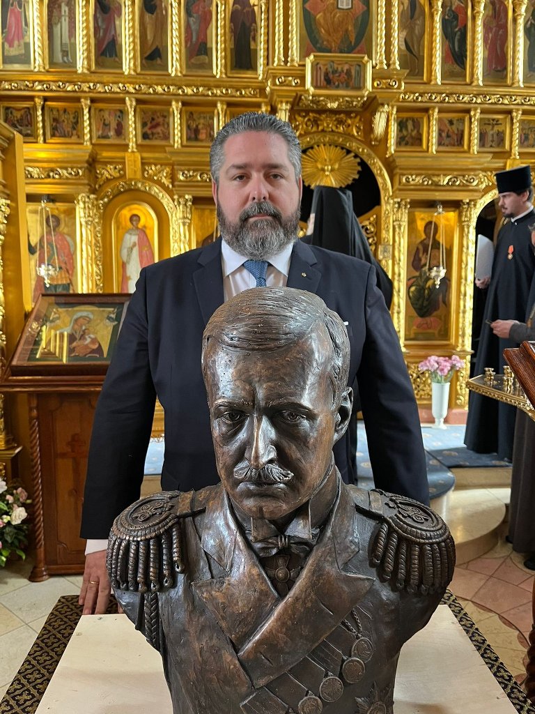 PHOTO: George Hohenzollern posing with a bust of his traitor great-grandfather Grand Duke Kirill Vladimirovich in the the Smolensk Zosimova Pustyn Monastery