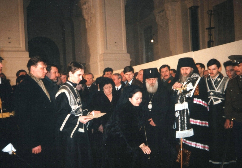 The burial ceremony was scheduled for 12-00. After the arrival of the Leonida, Maria and George, the clergy, Mayor of St. Petersburg Anatoly Sobchak (1937-2000) and representatives of the administration of St. Petersburg, a pannikhida was held, which was served by Bishop Lev (Tserpitsky) of Novgorod Bishop Simon (Getya) of Tikhvin. At the end of the pannikhida, the coffins were lowered into pre-prepared niches with military honours.