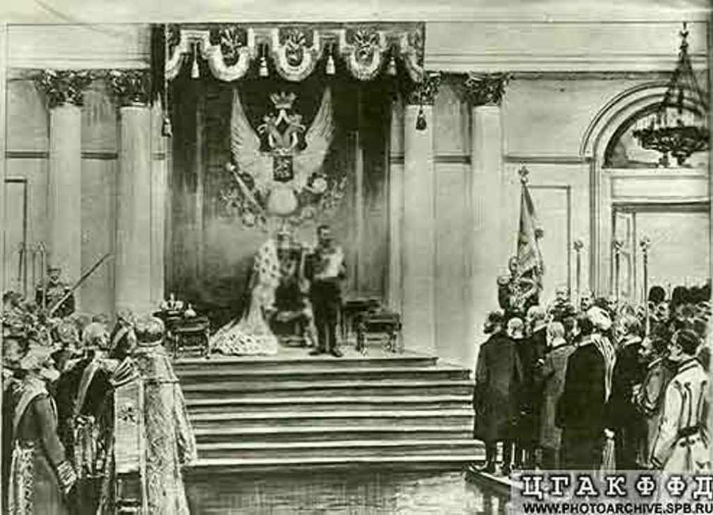 PHOTO: Emperor Nicholas II set against the backdrop of symbols of the Russian Empire and monarchy: the regalia, the throne and the double-headed eagle
