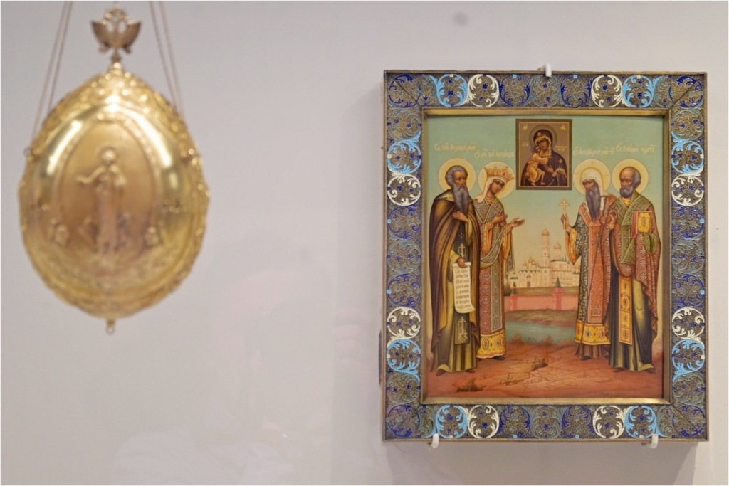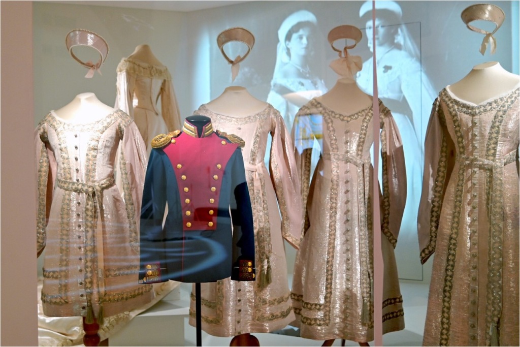It was here, that the kokoshniks were displayed, surrounded by glass display cases containing a number of elegant gowns and dresses from the wardrobes of the Dowager Empress Maria Feodorovna and Empress Alexandra Feodorovna. I thought it odd that they were among the collection of Pavlovsk Museum, especially given that neither the Dowager Empress, nor her son Nicholas II and his family, ever lived at Pavlovsk. As it turns out, they are all part of the collection of the Alexander Palace at Tsarskoye Selo.
