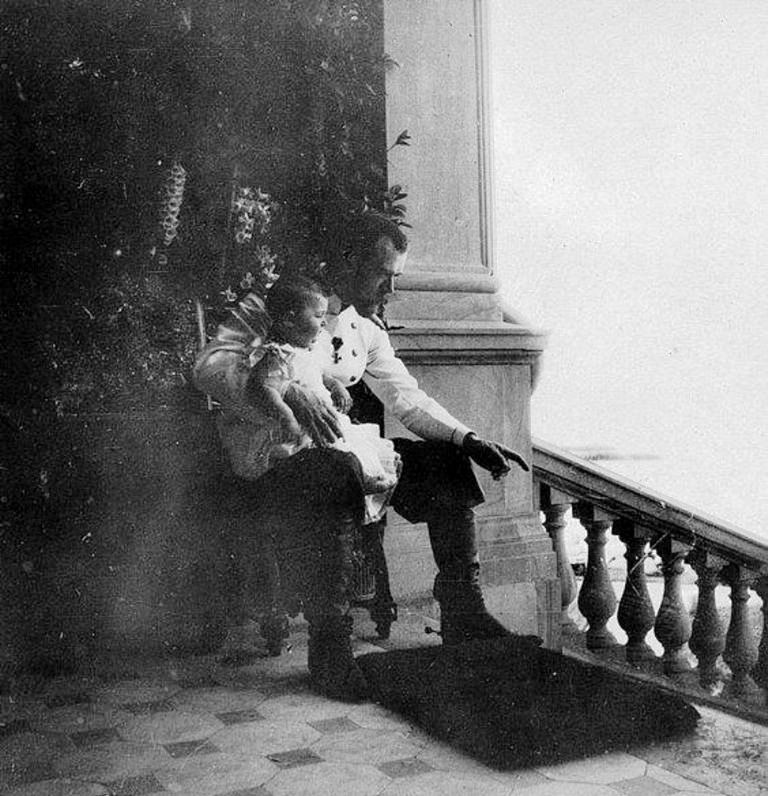 This endearing image shows the Emperor Nicholas II seated on the porch of the Lower Dacha, Peterhof, while holding his infant son and heir Tsesarevich Alexei, c. 1905.