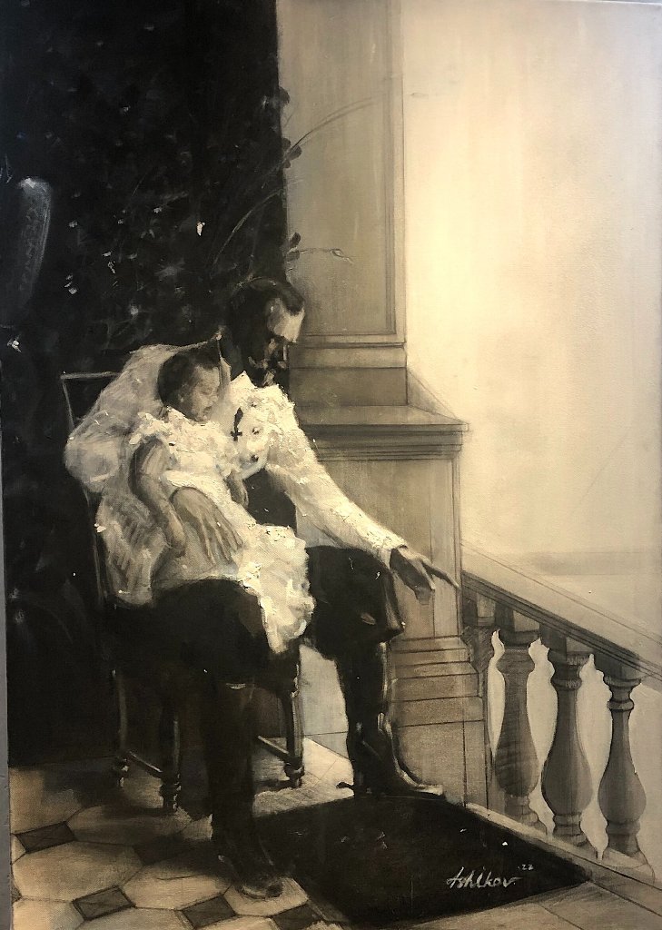 The culture of the late 19th century is directly and very closely related to the style in which the artist’s works are painted. Ashikov has managed to capture his August subject from iconic vintage photographs and paintings of the Tsar and his family. For instance, the portrait used for the exhibition poster (seen above) is based on a 1905 photograph of Nicholas II holding his infant son Alexei on his lap (see photo below) – it is truly beautiful beyond words!
