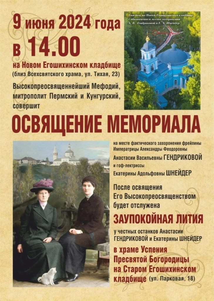 On Sunday, 9th June 2024, a memorial to two faithful servants of the Imperial Family, Anastasia Hendrikova and Ekaterine Schneider was installed near the Church of All Saints, situated at the site where they were buried in 1919, in the Old Yegoshikha Cemetery in Perm.
