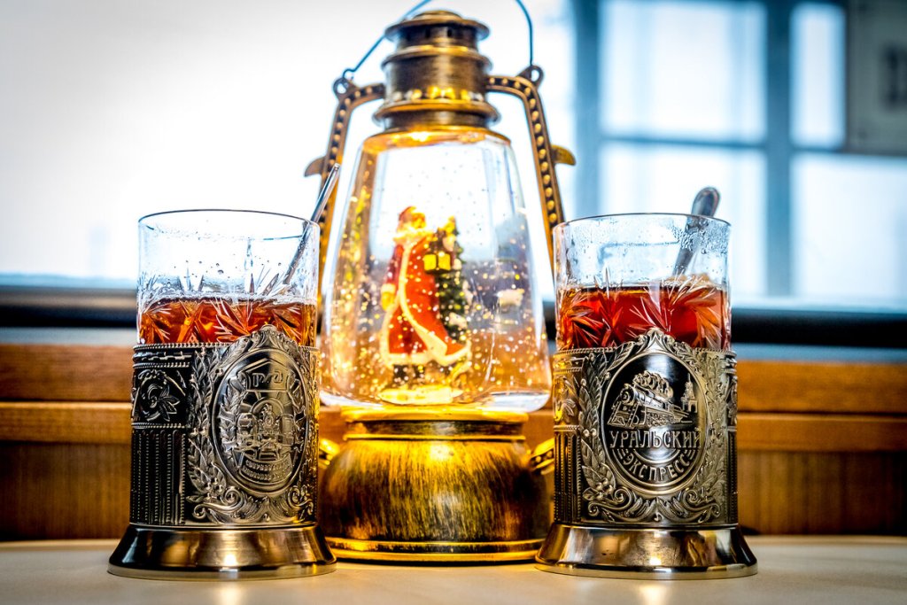 Tea is served to passengers from a traditional samovar. Conductors bring the tea in beautiful faceted glasses in iron cup holders, on which the Double-Headed Eagle of the Russian Empire is depicted.