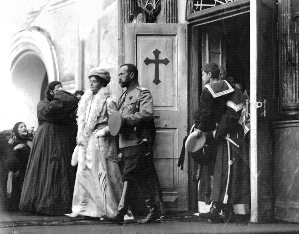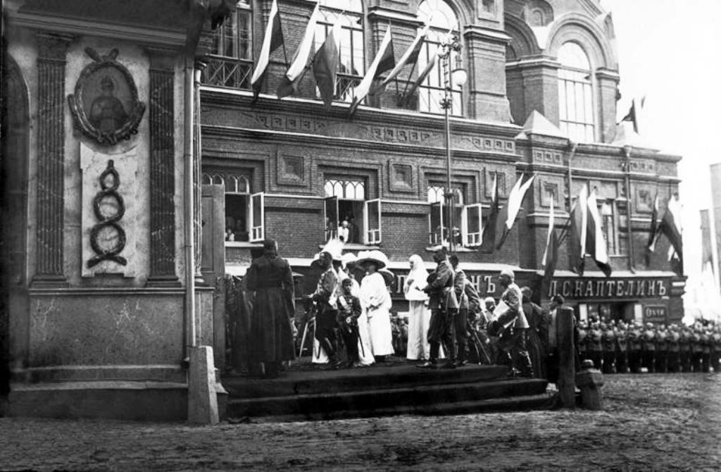 PHOTO: Nicholas II, Empress Alexandra Feodorovna and Tsesarevich Alexei Nikolaevich (being carried by the Cossack Alexei Petrovich Pilipenko (1887-1972) leaving the Iverskaya Chapel in Moscow