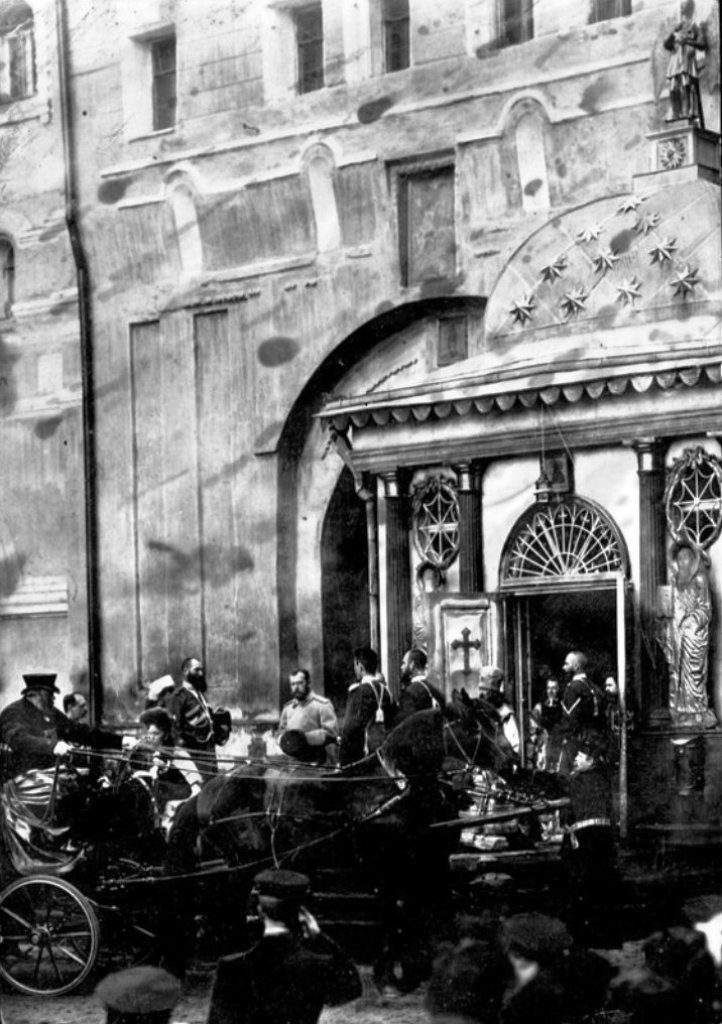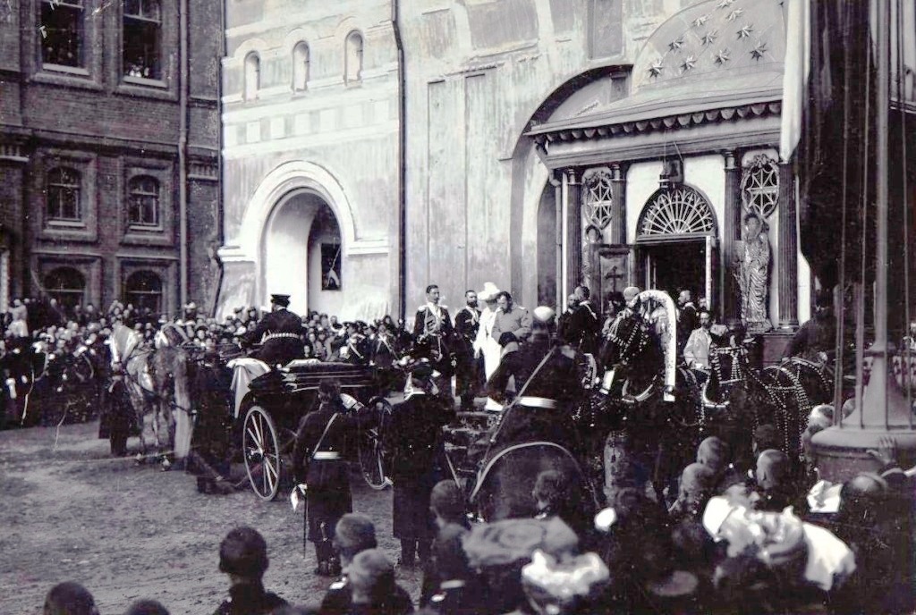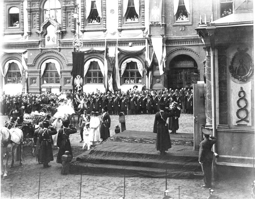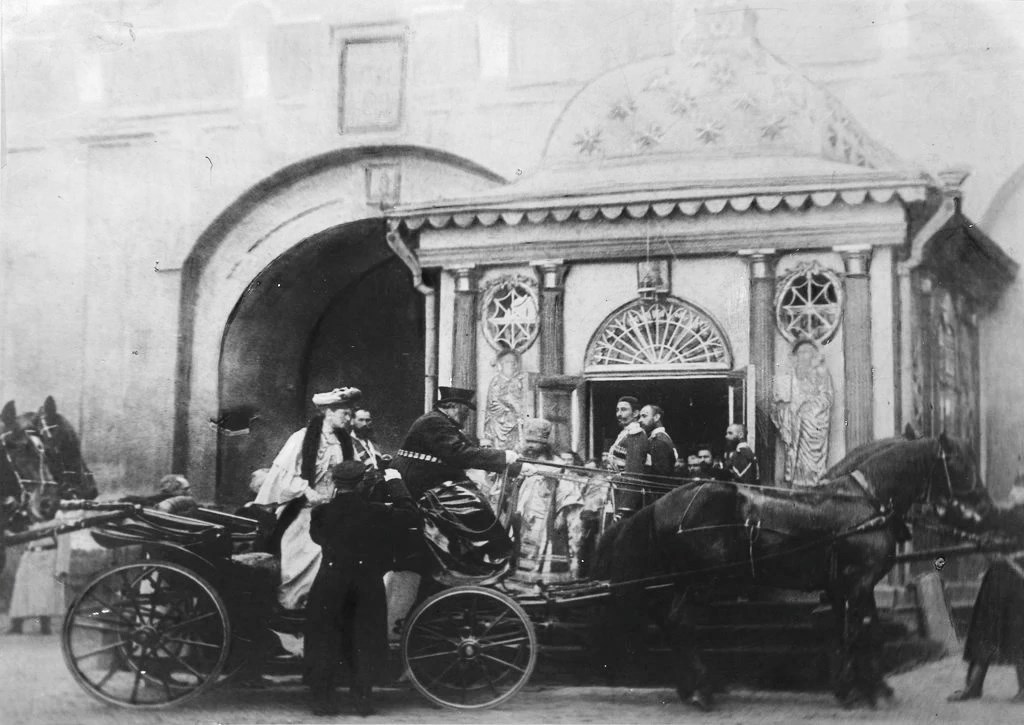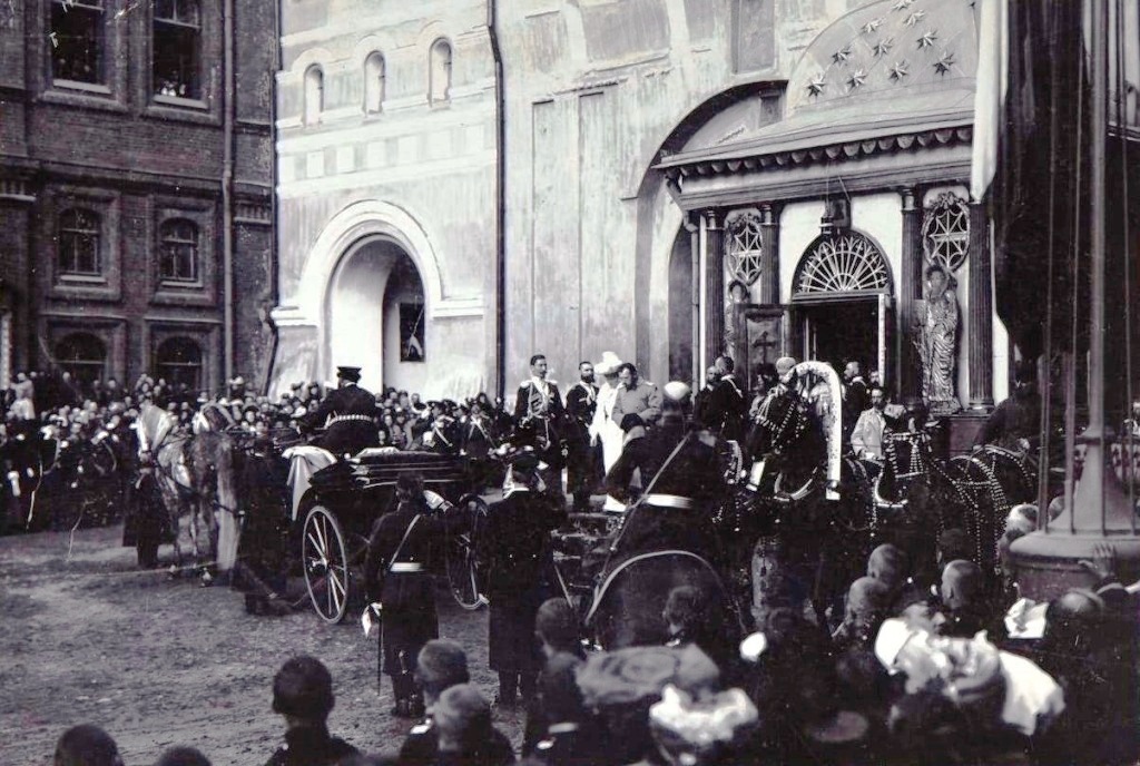In the above photo, Emperor Nicholas II, Empresses Alexandra Feodorovna and Maria Feodorovna are walking towards the Iverskaya Chapel of the Iberian Mother of God before the crowning of Russia’s last Tsar in the Assumption (Dormition) Cathedral in the Kremlin on 26th (O.S. 14th) May 1896.